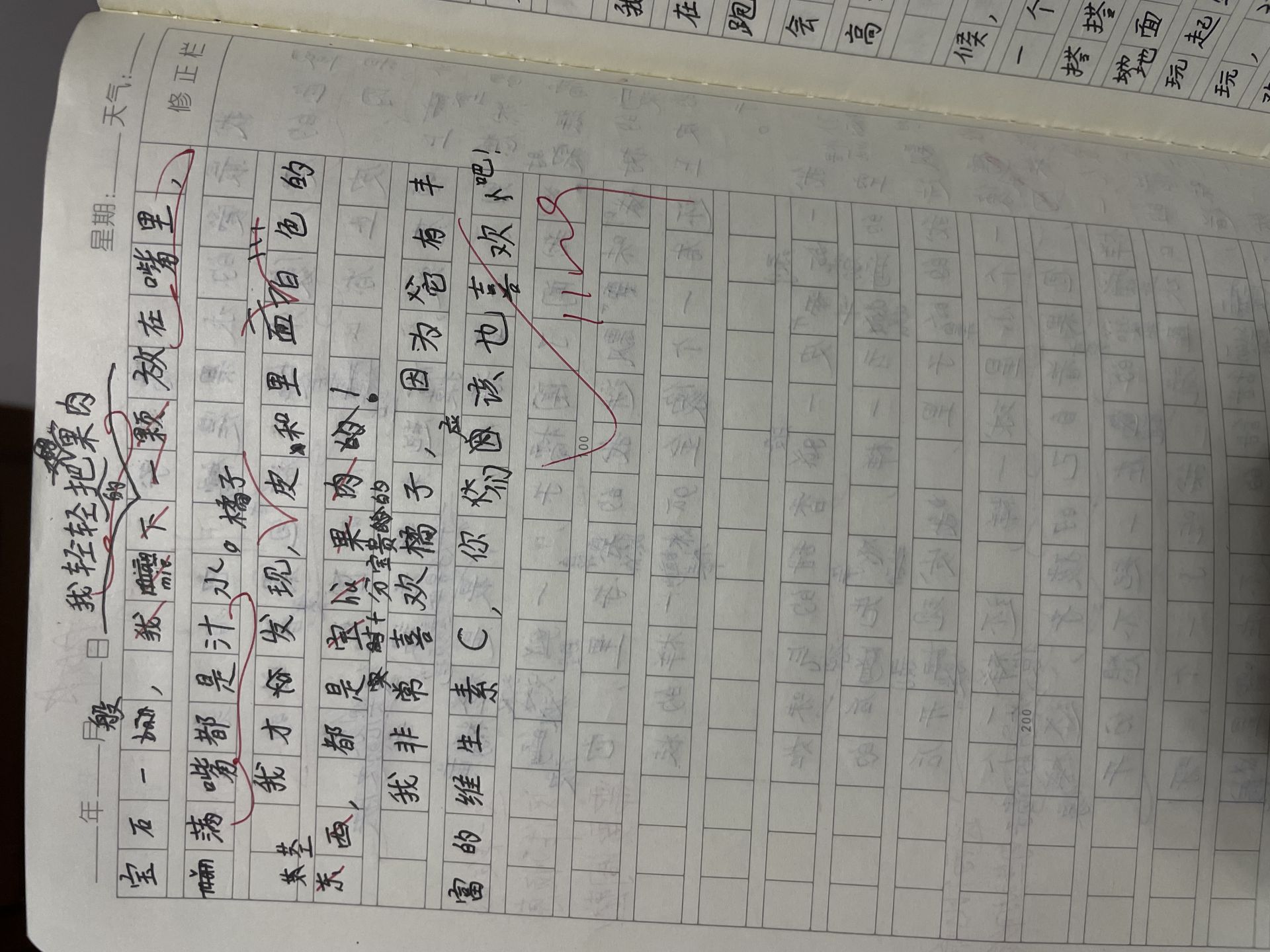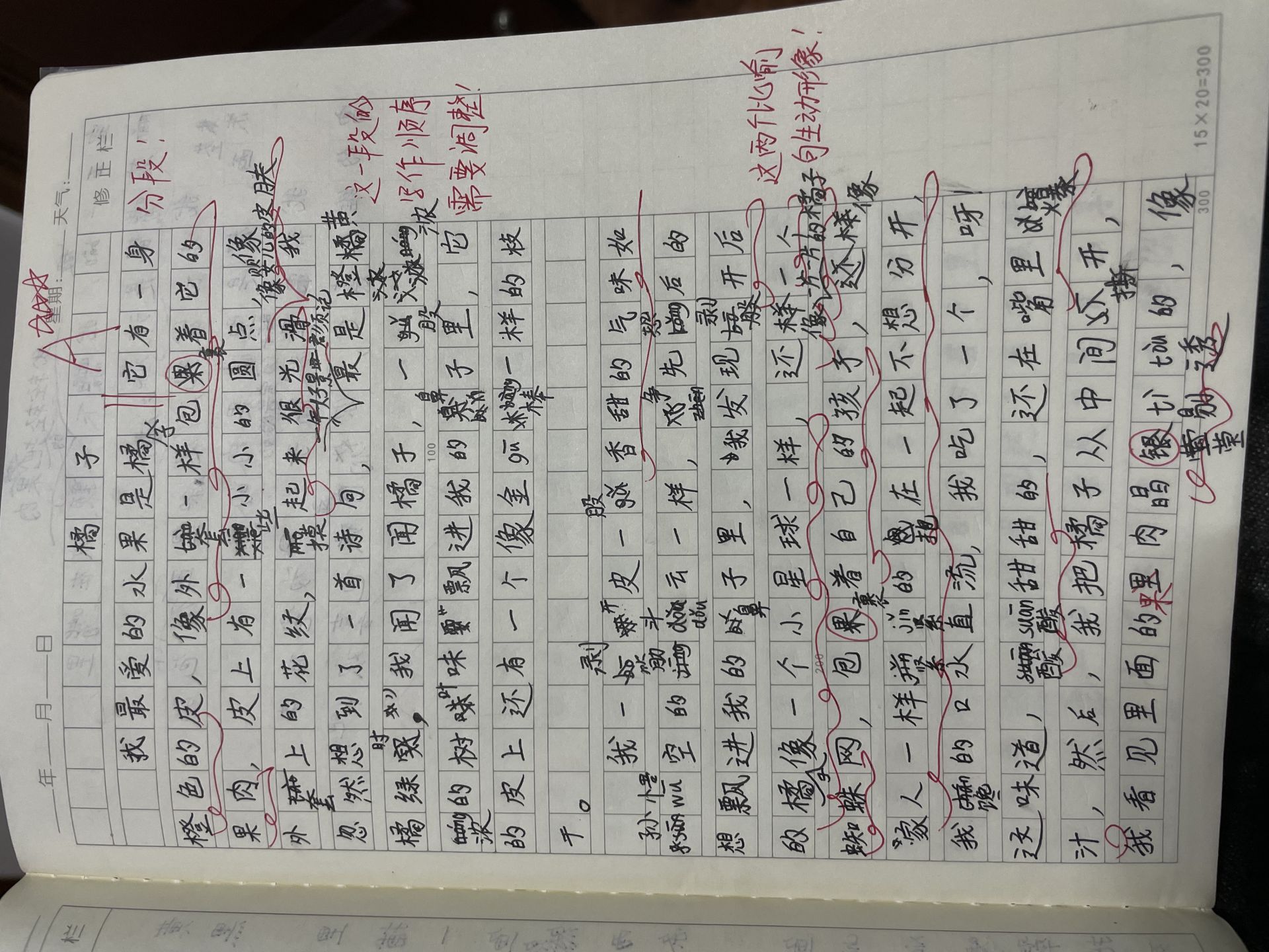 我一剥开皮,一股香甜的气味如孙悟空的筋斗云一样,争先恐后的想飘进我的鼻子里,我发现剥开后的橘子像一个小星球一样,还像一个蜘蛛网,包裹着自己的孩子,一片一片的橘子像家人一样紧紧的抱在一起,不想分开。我馋得口水直流,我吃了一个,呀,这味道,酸酸甜甜的。还在嘴里爆汁,然后,我把橘子从中间撕开,我看见里面的果肉晶莹剔透,像宝石一般,我轻轻的把果肉放在嘴里,满嘴都是汁水。我才发现,橘子皮和里面的白色的茎,都是十分宝贵的。
