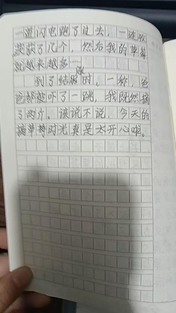 刚走进草莓园,我就被眼前各种各样样的蔬菜看到眼花瞭乱.提上篮子,走进大棚,只见红彤彤的草莓出现在我的眼前,我立马跑到草莓苗旁边,摘了一个下来,迫不及待的放入了口中,那草味又香甜又好吃,汁水迅速布满了口腔,连空气都充满了草莓味.我看着眼前密密麻麻的草莓苗,心里一顿怀笑.突然,我找到了几颗颜色像巧克力一样的草莓。我像一道闪电跑了过去,一连收没获了几个,然后我的草莓就越来越多.......