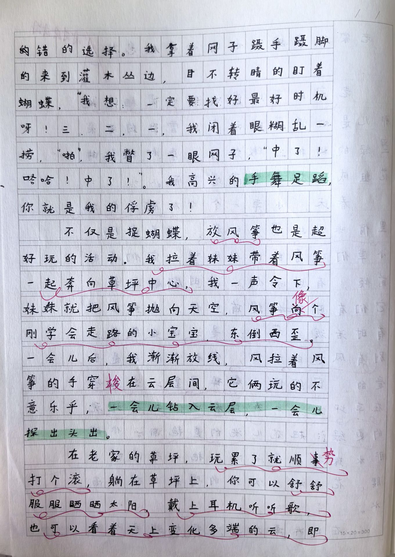 不仅是捉蝴蝶,放风筝也是超好玩的活动。我拉着妹妹带着风筝一起奔向草坪中心,我一声令下,像妹妹就把风筝抛向天空,风筝像个刚学会走路的小宝宝,东倒西歪,一会儿后,我渐渐放线,风拉着风筝的手穿梭在云层间,它俩玩的不意乐乎,一会儿钻入云层,一会儿探出头。