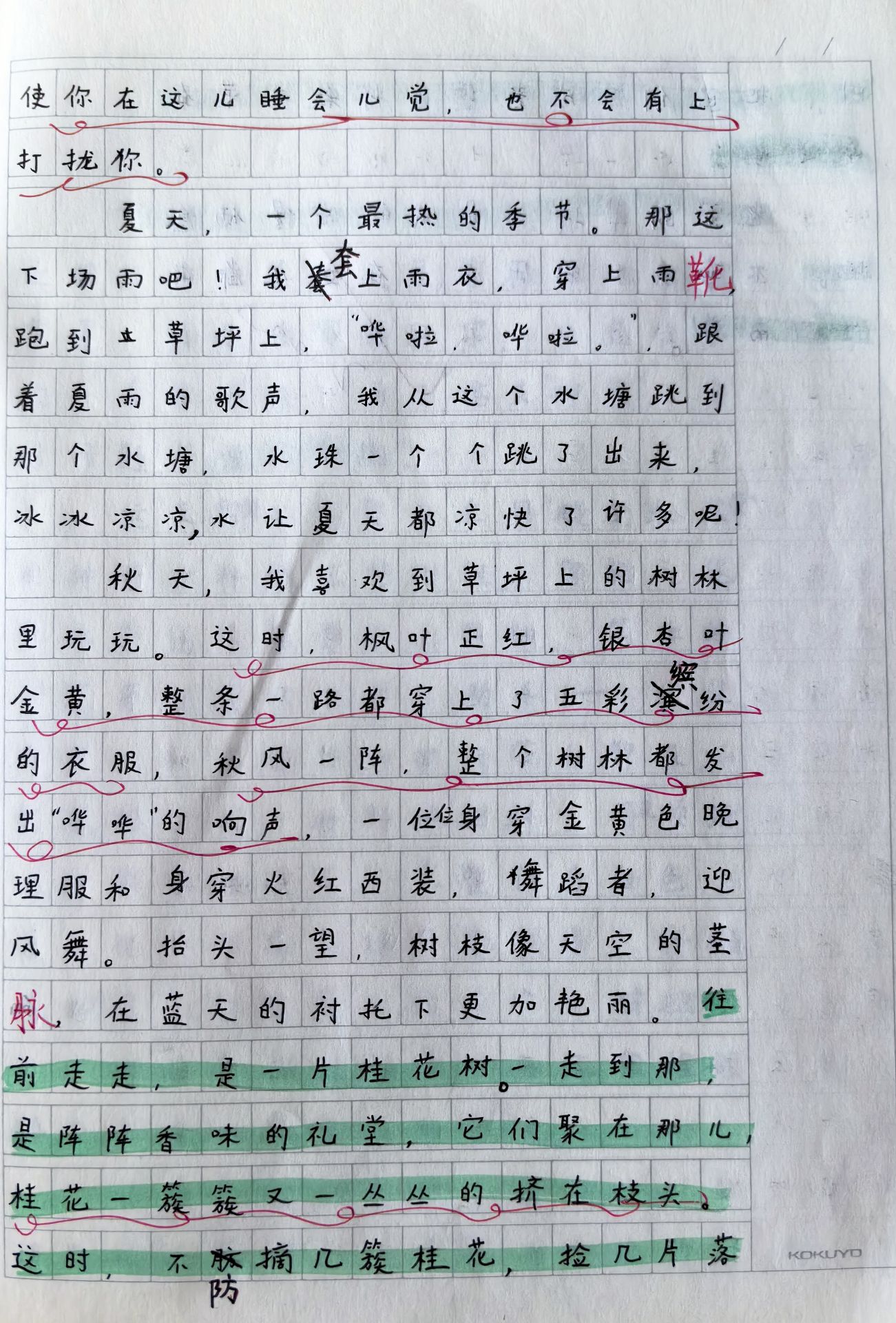夏天,一个最热的季节。那这下场雨吧!我套上雨衣,穿上雨靴跑到草坪上,"哗啦,哗啦。"跟着夏雨的歌声,我从这个水塘跳到那个水塘,水珠一个个跳了出来,冰冰凉凉,水让夏天都凉快了许多呢!