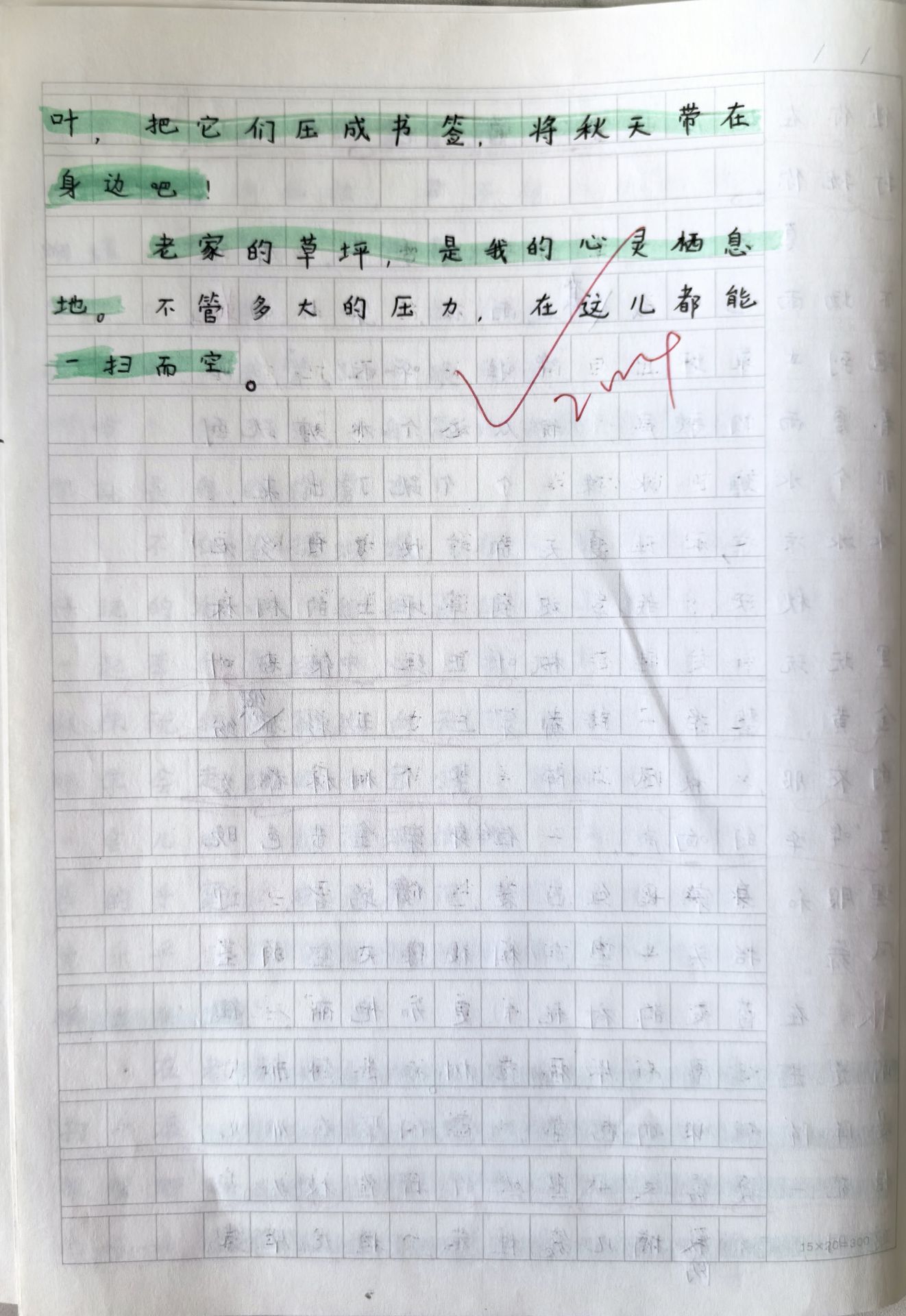有时我会带着书本来到这里,钻进我的秘密基地,坐在青绿色的草地上读书,有时阳光会透过树叶洒在我身上。除了看书,我也会在这小小“房间”里发呆、睡觉、玩耍、休息……