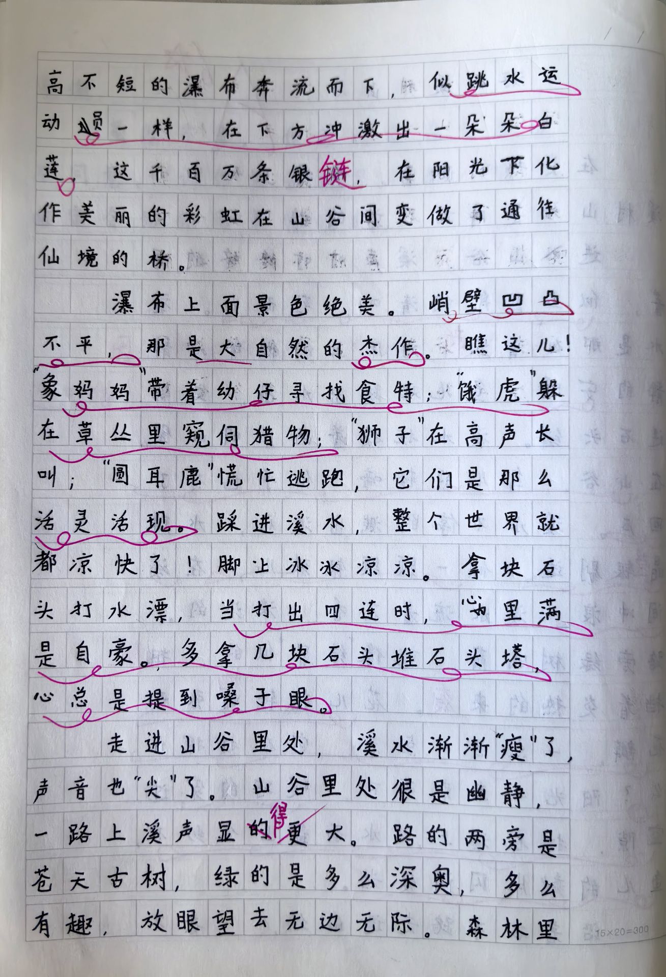 瀑布上面景色绝美。峭壁凹凸不平,那是大自然的杰作。瞧这儿!象妈妈带着幼仔寻找食物;“饿虎”躲在草丛里窥伺猎物;"狮子"在高声长叫;"圆耳鹿"慌忙逃跑,它们是那么活灵活现。踩进溪水,整个世界就都凉快了!脚上冰冰凉凉。拿块石头打水漂,当打出四连时,"心里满是自豪。多拿几块石头堆石头塔,心总是提到嗓子眼。