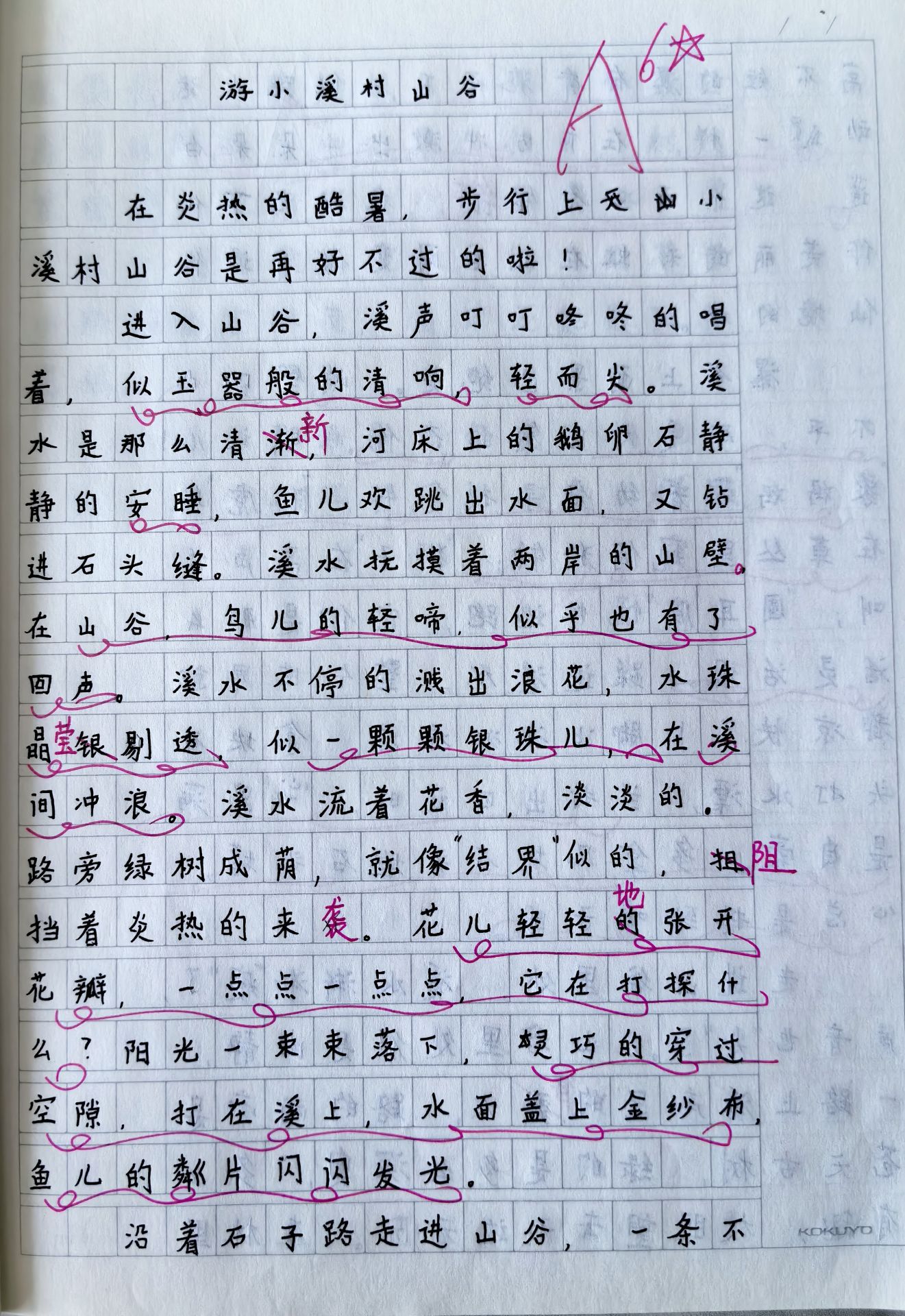 进入山谷,溪声叮叮咚咚的唱着,似玉器般的清响,轻而尖。溪水是那么清新,河床上的鹅卵石静静的安睡,鱼儿欢跳出水面,又钻进石头缝。溪水抚摸着两岸的山壁。在山谷,鸟儿的轻啼,似乎也有了回声。溪水不停的溅出浪花,水珠晶莹剔透,似一颗颗银珠儿,在溪间冲浪。溪水流着花香,淡淡的。路旁绿树成荫,就像结界似的,阻挡着炎热的来袭。花儿轻轻的张开花瓣,一点点一点点,它在打探什么?阳光一束束落下,灵巧的穿过空隙,打在溪上,水面盖上金纱布,鱼儿的粼片闪闪发光。
