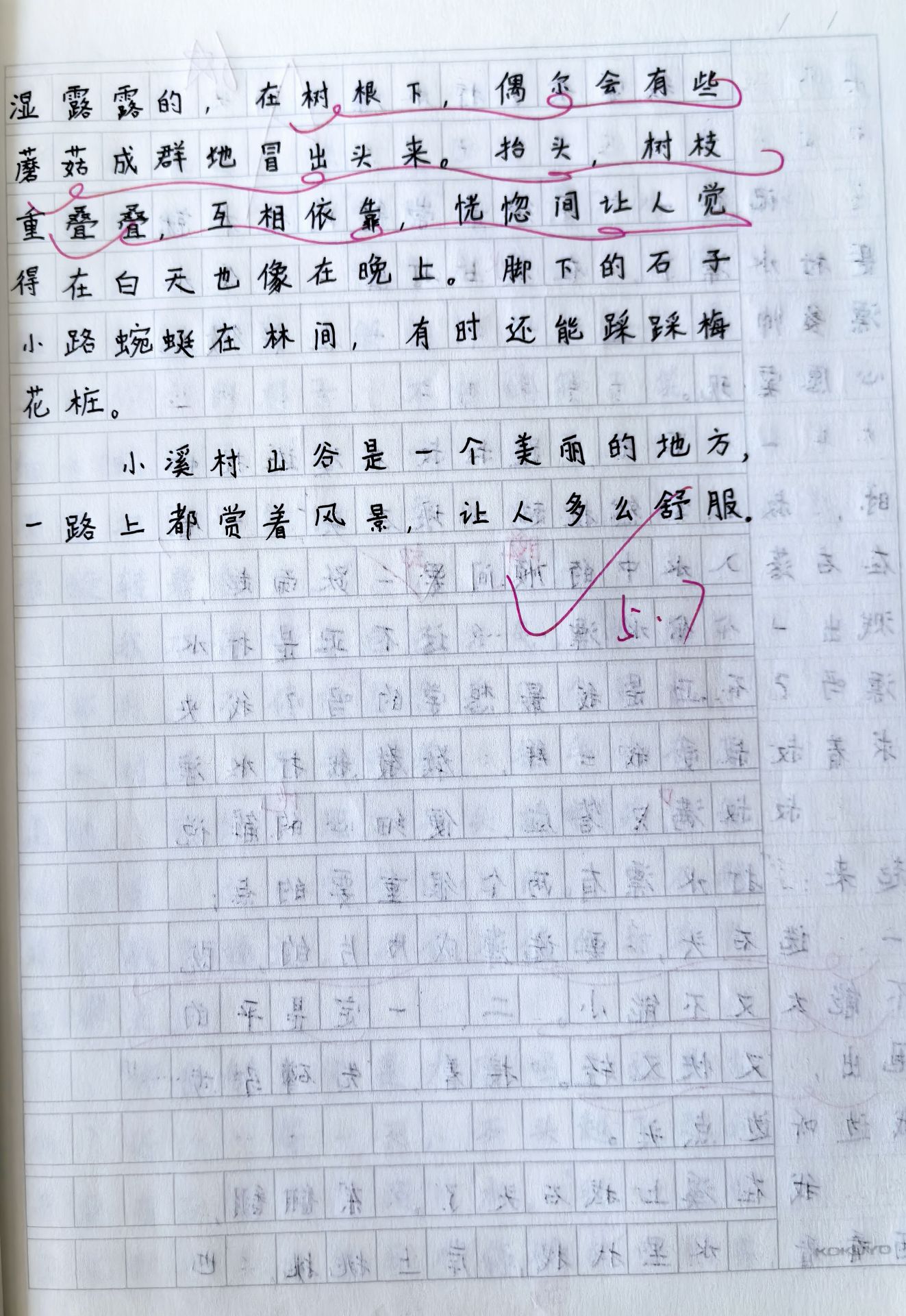 走进山谷里处,溪水渐渐"瘦"了,声音也"尖"了。山谷里很是幽静,一路上溪声显得更大。路的两旁是苍天古树,绿的是多么深奥,多么有趣,放眼望去无边无际。森林里湿漉漉的,在树根下,偶尔会有些蘑菇成群地冒出头来。抬头,树枝重重叠叠,互相依靠,恍惚间让人觉得在白天也像在晚上。脚下的石子小路蜿蜒在林间,有时还能踩踩梅花桩。
