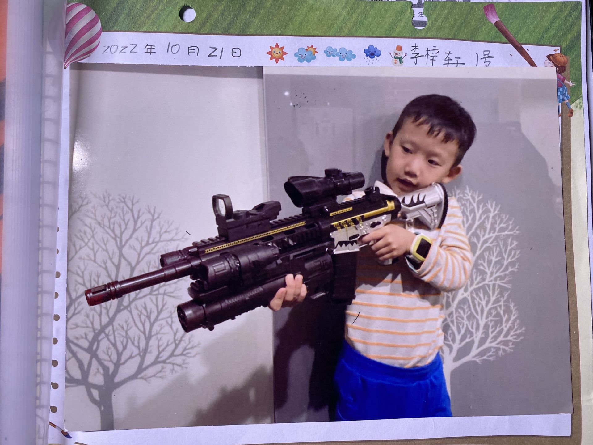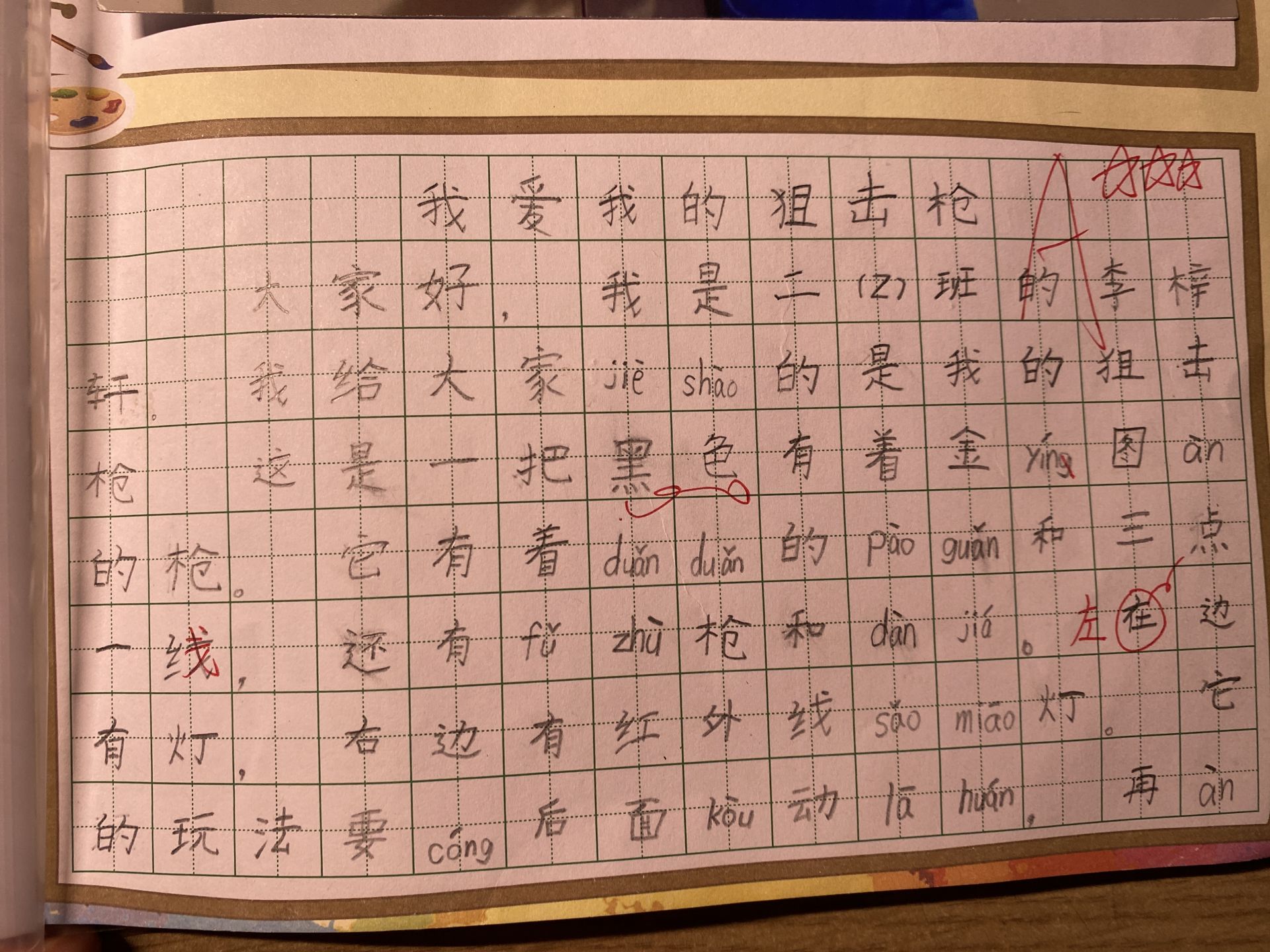大家好,我是二(2)班的李梓轩,我给大家介绍的是我的狙击枪。这是一把黑色有着金银图案的枪。它有着短短的炮管和三点一线,还有辅助枪和弹夹。左边有灯,右边有红外线扫描灯。它的玩法要从后面扣动拉环,再按动按钮,打出子弹,命中目标就可以了!乘人不备,突然出击。我的讲解完毕,感谢大家的收听。