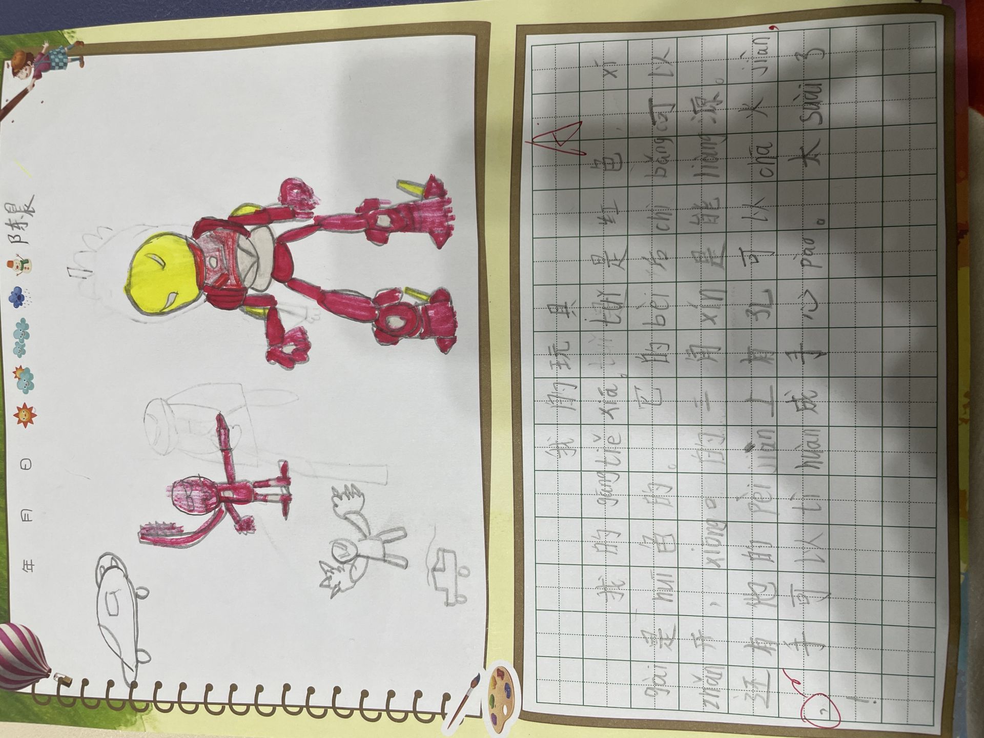 钢铁侠是美国漫威电影的其中一位英雄。他很聪明,所以创造出了钢铁侠,长大我也要创造出一个属于自己的钢铁侠!