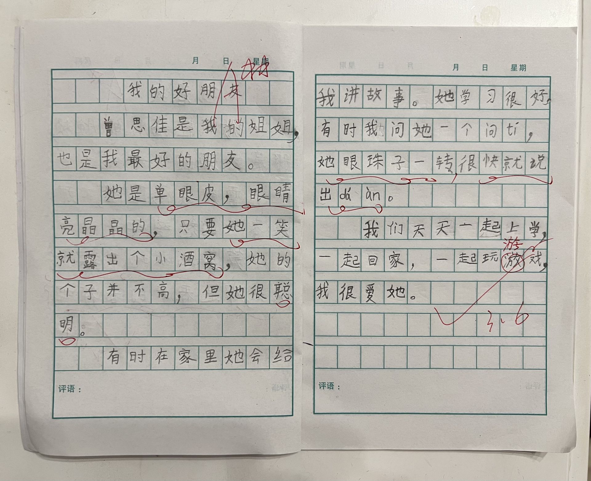 我有一个好朋友,她是我的同学,名叫曾思佳。 她有一张圆圆的脸和一张樱桃小嘴。她的个子不高,还有点瘦小,笑起来有个小酒窝。别看她又瘦又小,她的身手可敏捷了。她读幼儿园就会空翻了! 她的学习很好,不过我觉得她画画更好。她喜欢画画,我的梦想是成为画家,所以我们俩经常一起画画。我觉得她是我画画的榜样。有一次我看到她画的纸老虎,简直太漂亮了,就像真的一样。她也经常教我画画。 我实在太喜欢这位朋友了。
