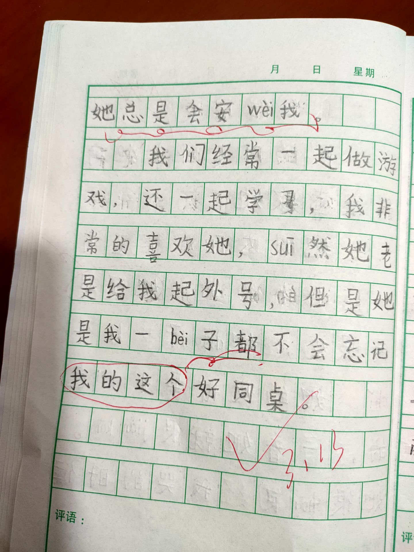 我们经常一起做游戏还一起学习,我非常的喜欢她,虽然她老是给我起外号,但是她是我一辈子都不会忘记的好同桌