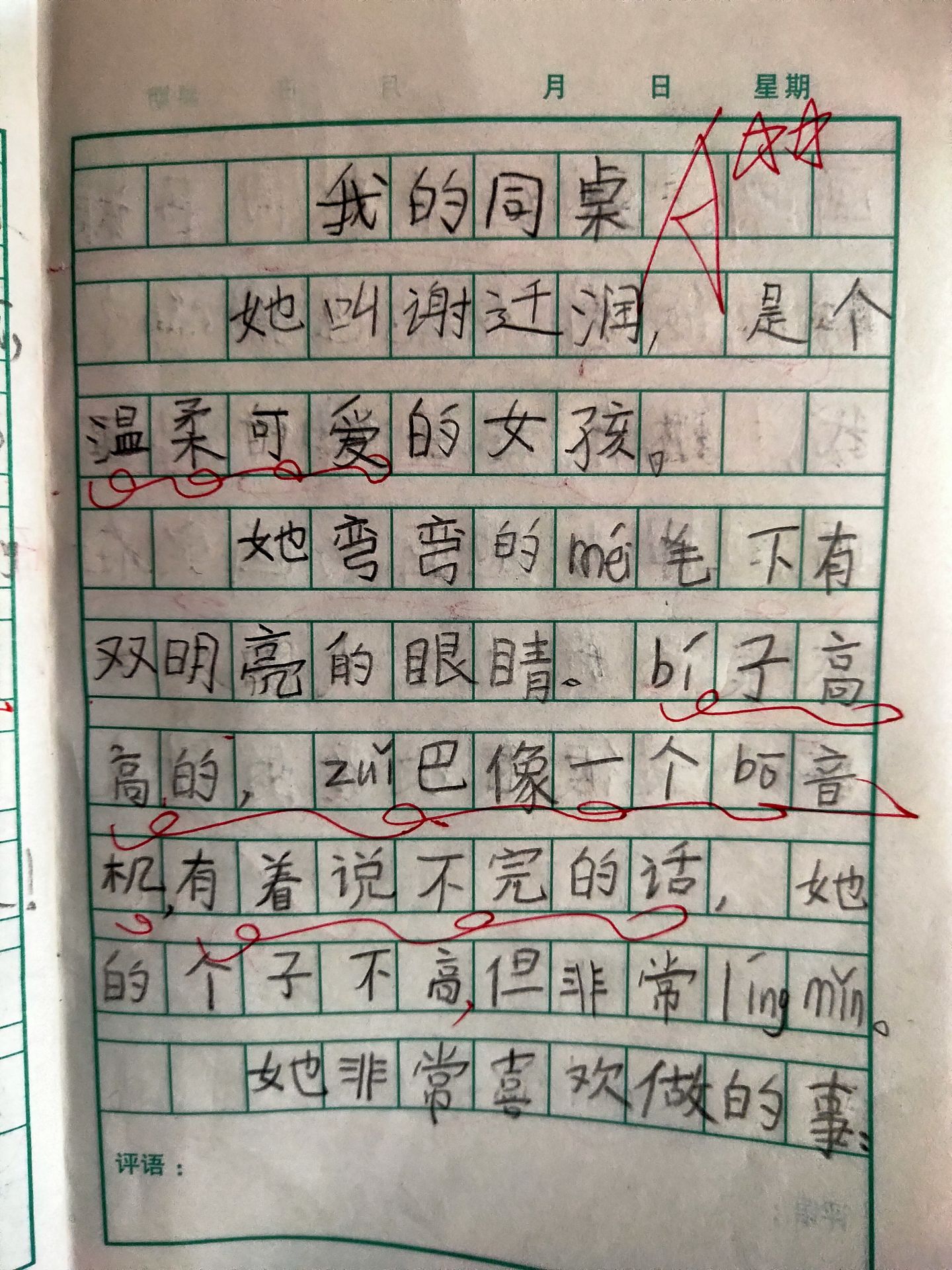 她的耳朵前面有颗痣,她笑起来很可爱,脸红彤彤的,我挺喜欢我的同桌。