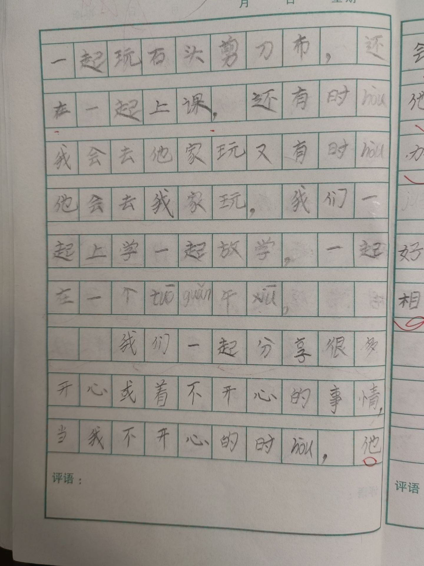 我们一起打篮球,一 起玩石头剪刀布, 还在一起上课, 有时我会去他家玩又有时他会来我家玩,我们一起上学一起放学,一起在同一个托管午休。
