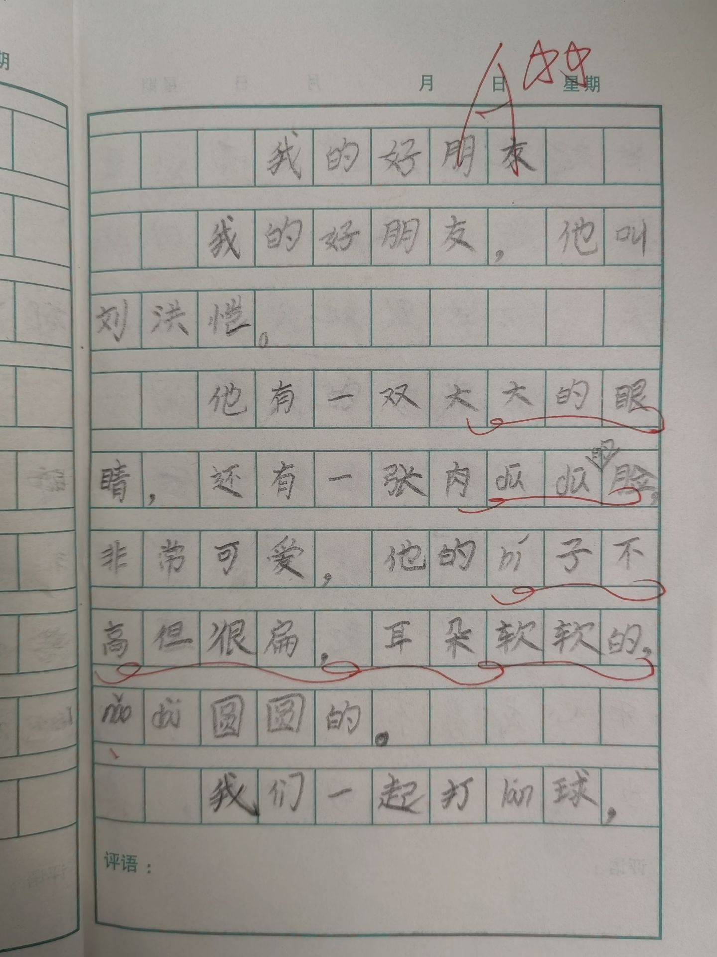 我的好朋友,他叫周延凯, 他是瓜子脸, 葡萄牙。他喜欢运动,例如: 打篮球、跳绳等等, 平常我们俩喜欢玩摔跤,老鼠偷油。