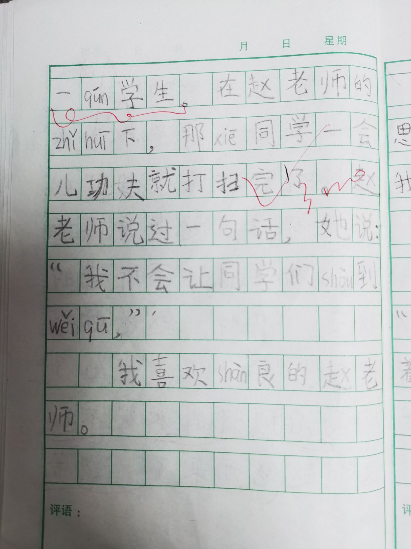 有一次我上学时遇见了赵老师,我跟赵老师说姐姐拿了好多奖,而我没拿几个奖,所以我觉得我是个“小学渣”,赵老师说:“不要弃磊,继续努力!”赵老师的鼓励像一束阳光,永远照耀着我成长!