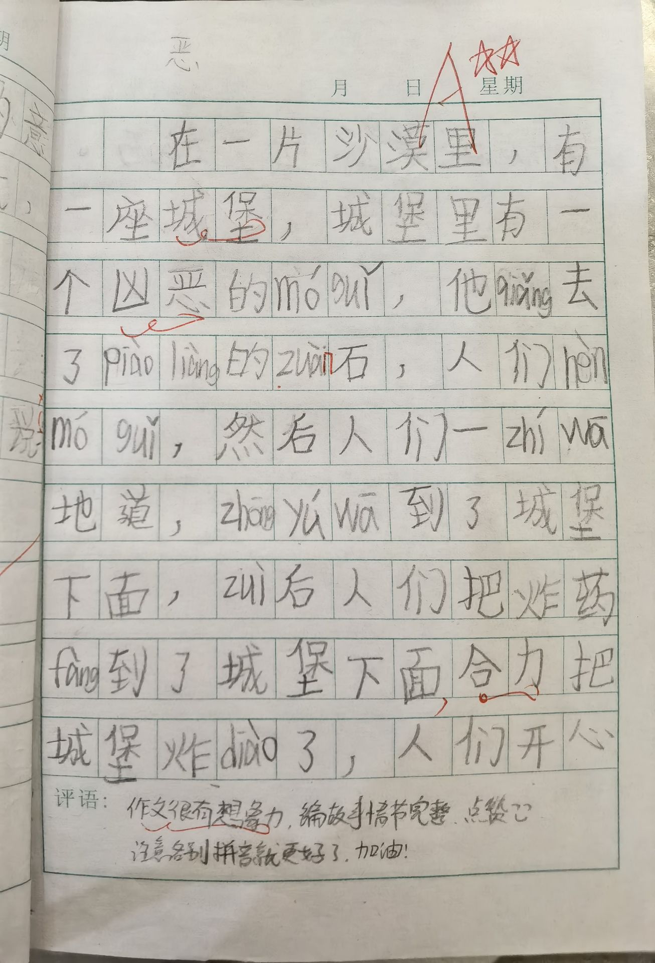 在一片沙漠里,有一座城堡,城堡里有个凶恶的魔鬼,他抢去了漂亮的钻石。人们恨魔鬼,然后人们一直挖地道,终于挖到了城堡下面。最后人们把炸药放到了城堡下面,合力把城堡炸掉了,人们开心的欢呼着拿回钻石。