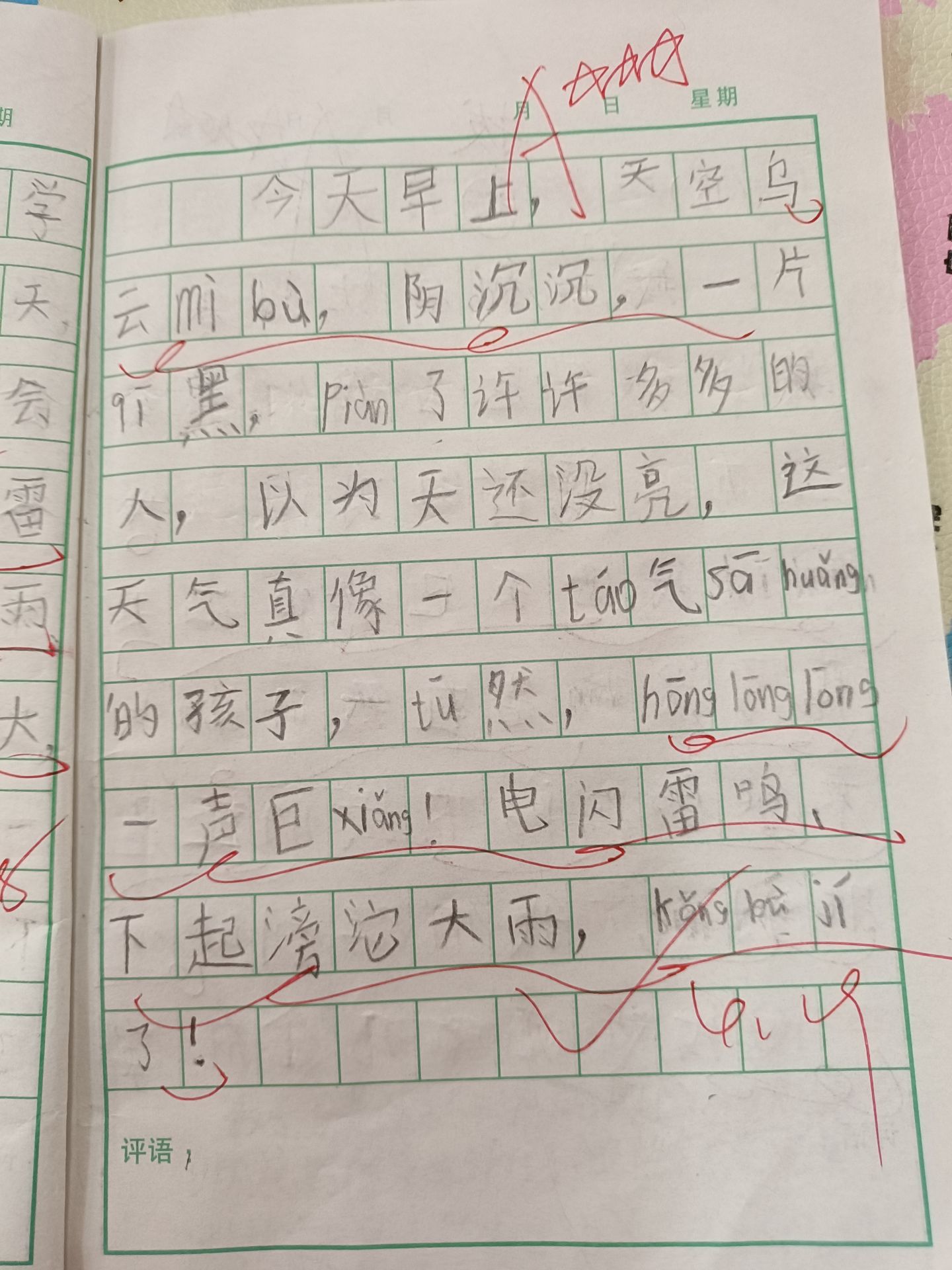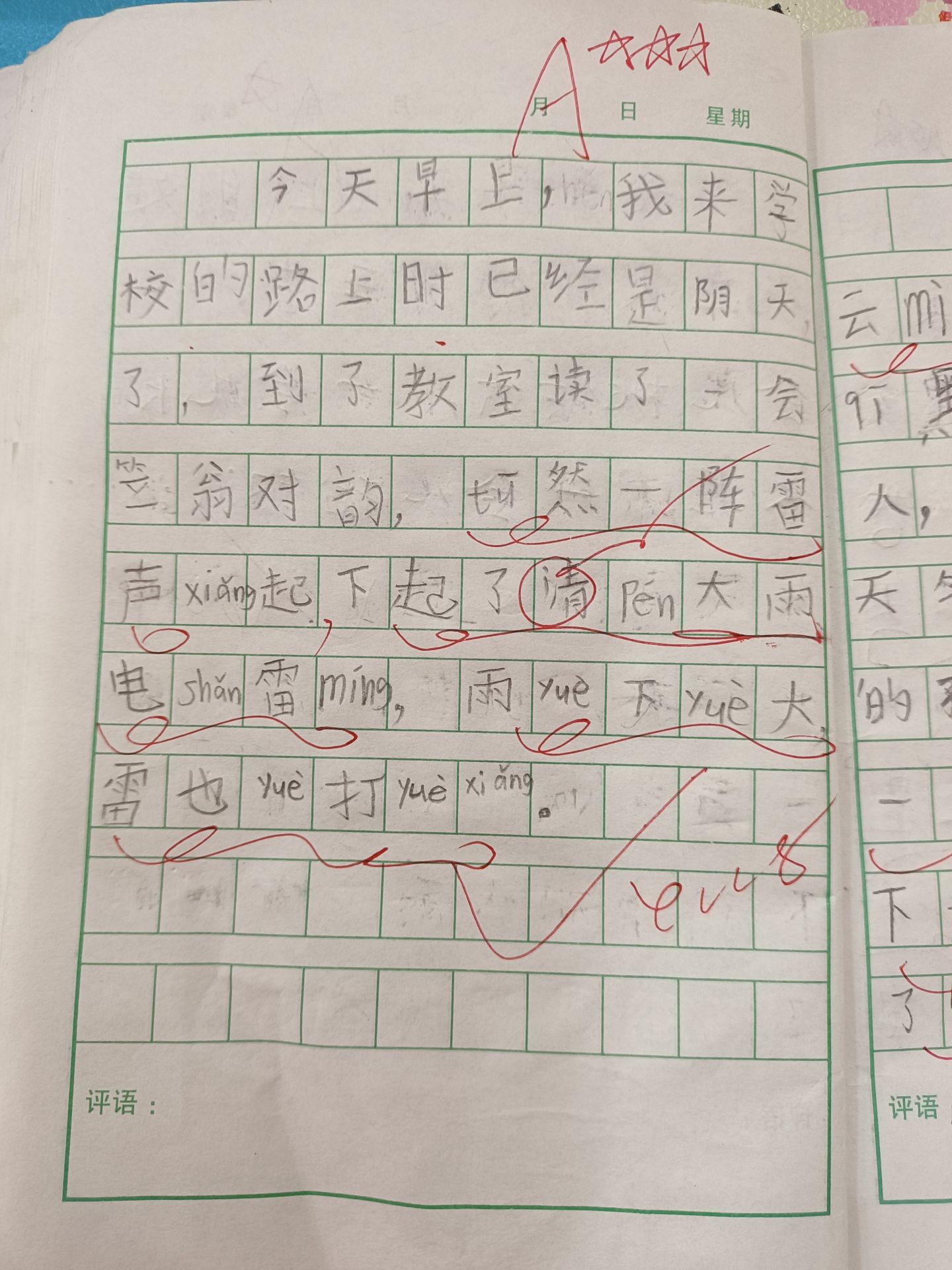 今天早上,我来学校的路上时已经是阴天了,到了教室,读了一会儿《笠翁对韵》,突然,一阵雷声响起,下起了倾盆大雨,电闪雷鸣,雨越下越大,雷也越打越响。