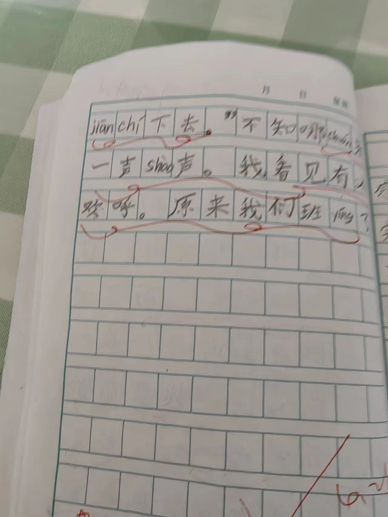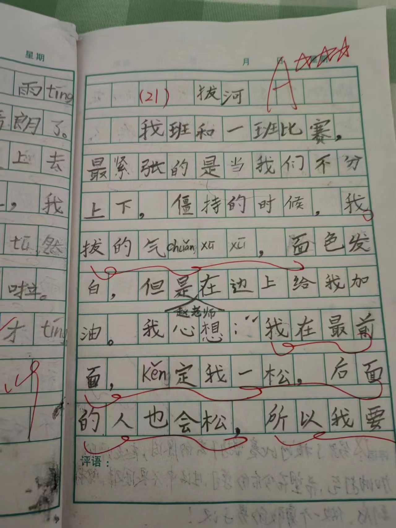 我班和一班比赛,最紧张的是当我们不分上下,僵持的时候,我拔的气chuǎn (喘)xū(吁)xū(吁),面色发白,但是赵老师在边上给我加油。我心想:“我在最前面,kěn(肯)定我一松,后面的人也会松。所以我要jiān(坚) chí(持)下去。”不知哪chuán(传)来一声shào(哨)声。我看见有人欢呼。原来我们yíng(赢)了。