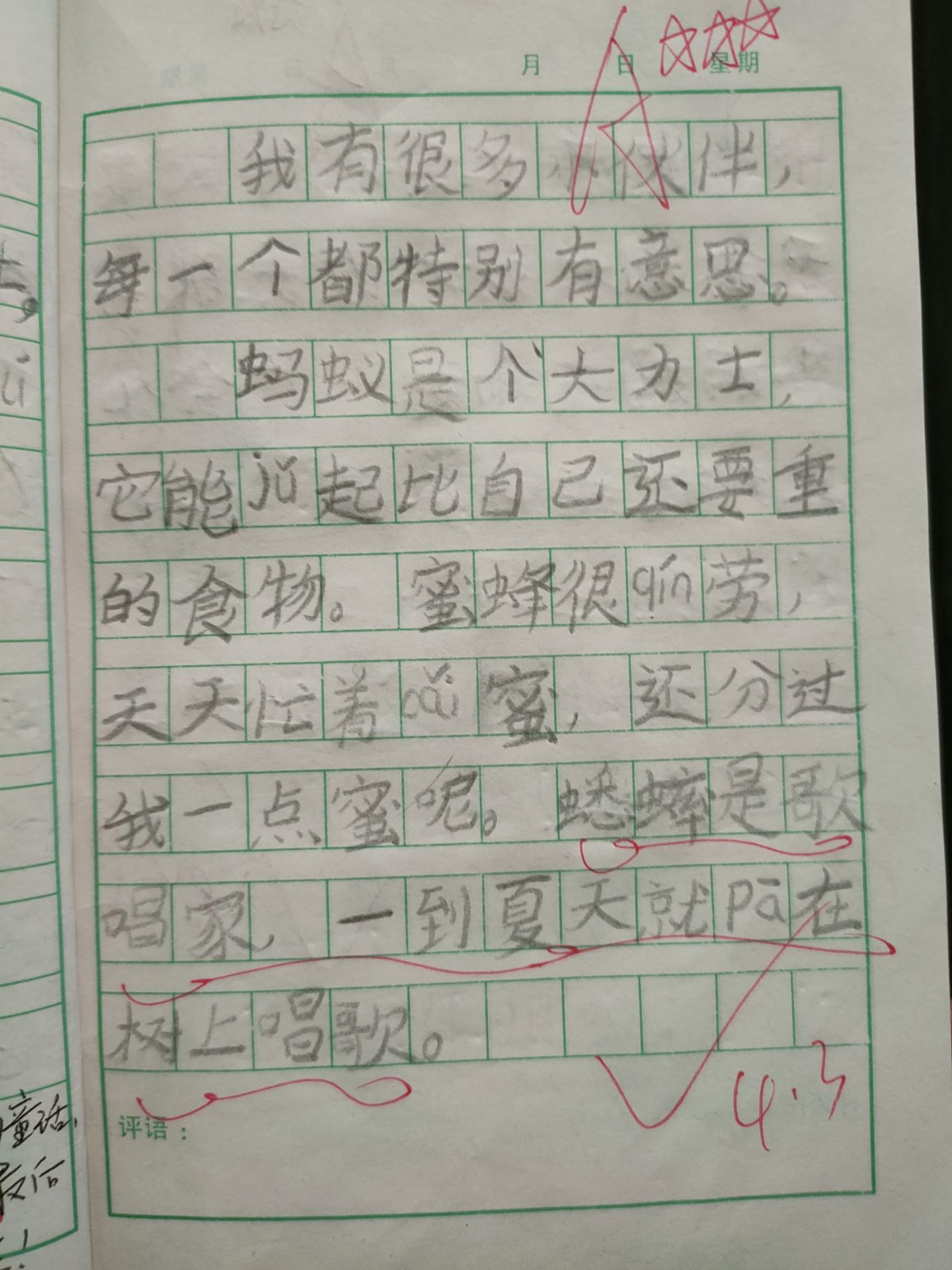 蚂蚁是个大力士,它能举起比自己还要重的食物。蜜蜂很勤劳,天天忙着采蜜,还分过我一点蜜呢。蟋蟀是歌唱家,一到夏天就趴在树上唱歌。