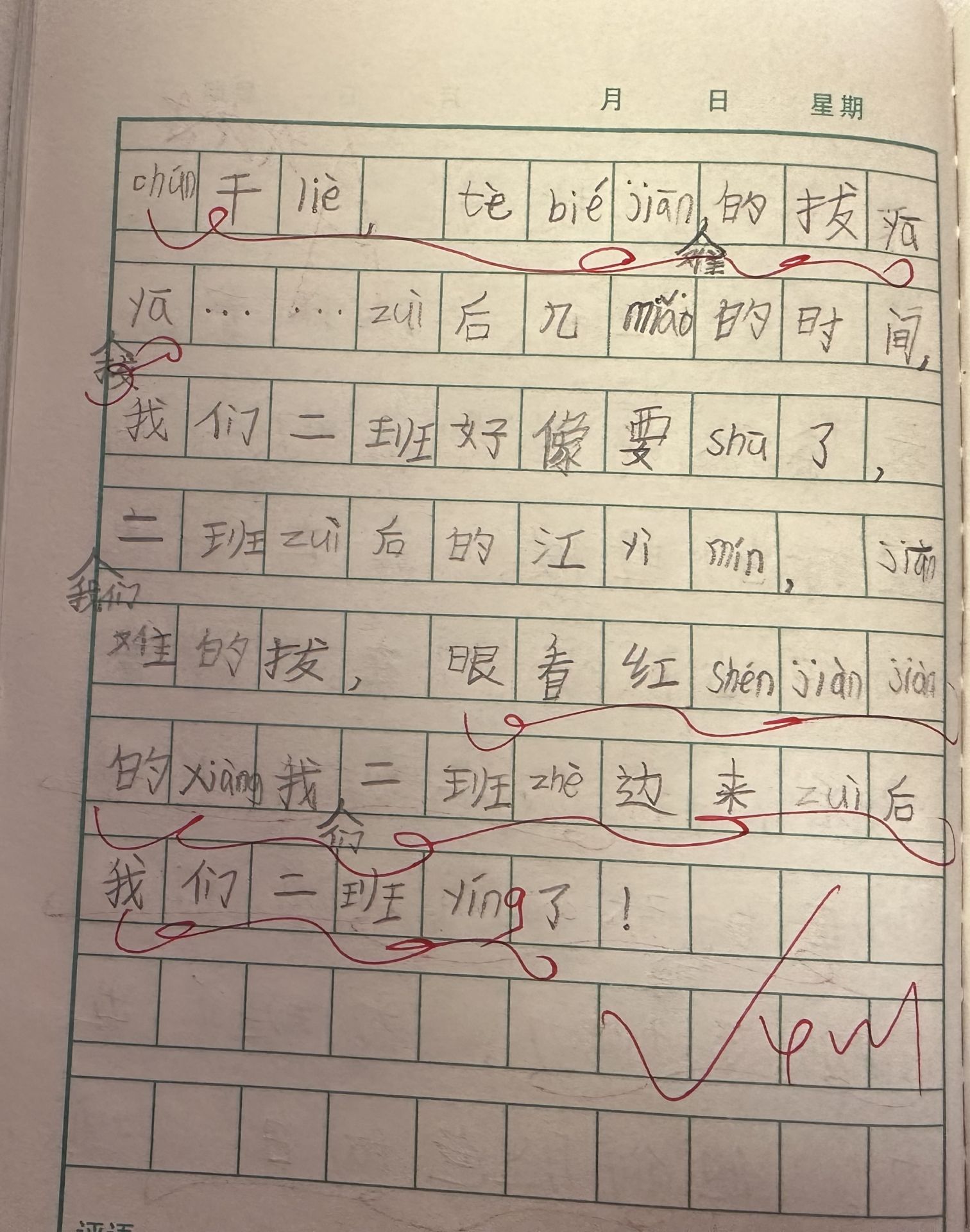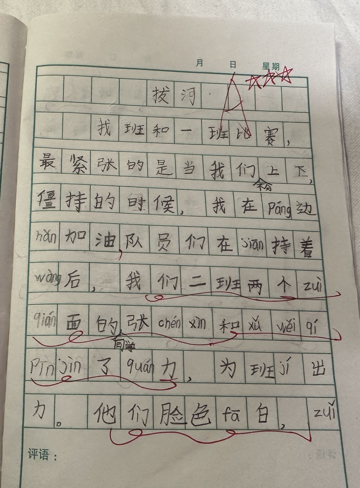 我班和一班拔河比赛,最紧张的是当我们不分上下僵持的时候,我在旁边喊加油,队员们在僵持着往后,我们二班两个最前面的同学张陈荇和许袆琪拼尽了全力,为班级出力。他们脸色发白,嘴唇干裂,特别艰难的拔呀拔呀……最后几秒的时间,我们二班好像要输了。我们二班最后的江弈鸣艰难地拔,眼看红绳渐渐地向我们二班这边过来了,最后我们二班赢了!