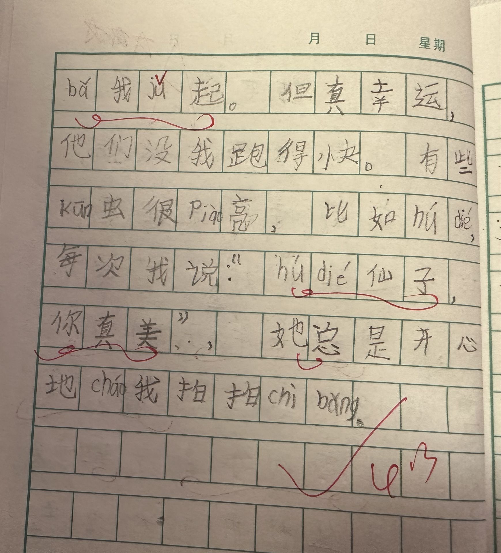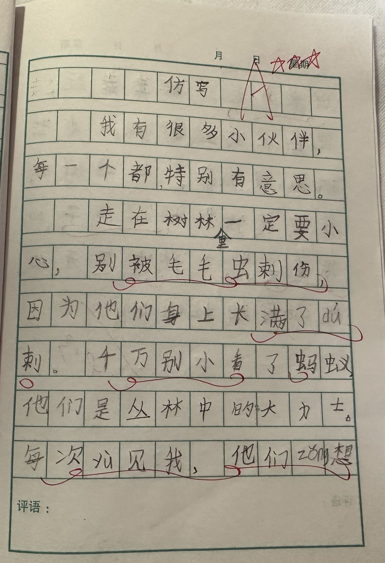 走在树林里,一定要小心,别被毛毛虫刺伤,因为他们身上长满了毒刺。千万别小看了蚂蚁,他们是丛林中的大力士。每次遇见我,他们总想把我举起。但真幸运,他们没我跑得快。有些昆虫很漂亮,比如蝴蝶,每次我说:“蝴蝶仙子,你真美!”她总是开心地朝我拍拍翅膀。