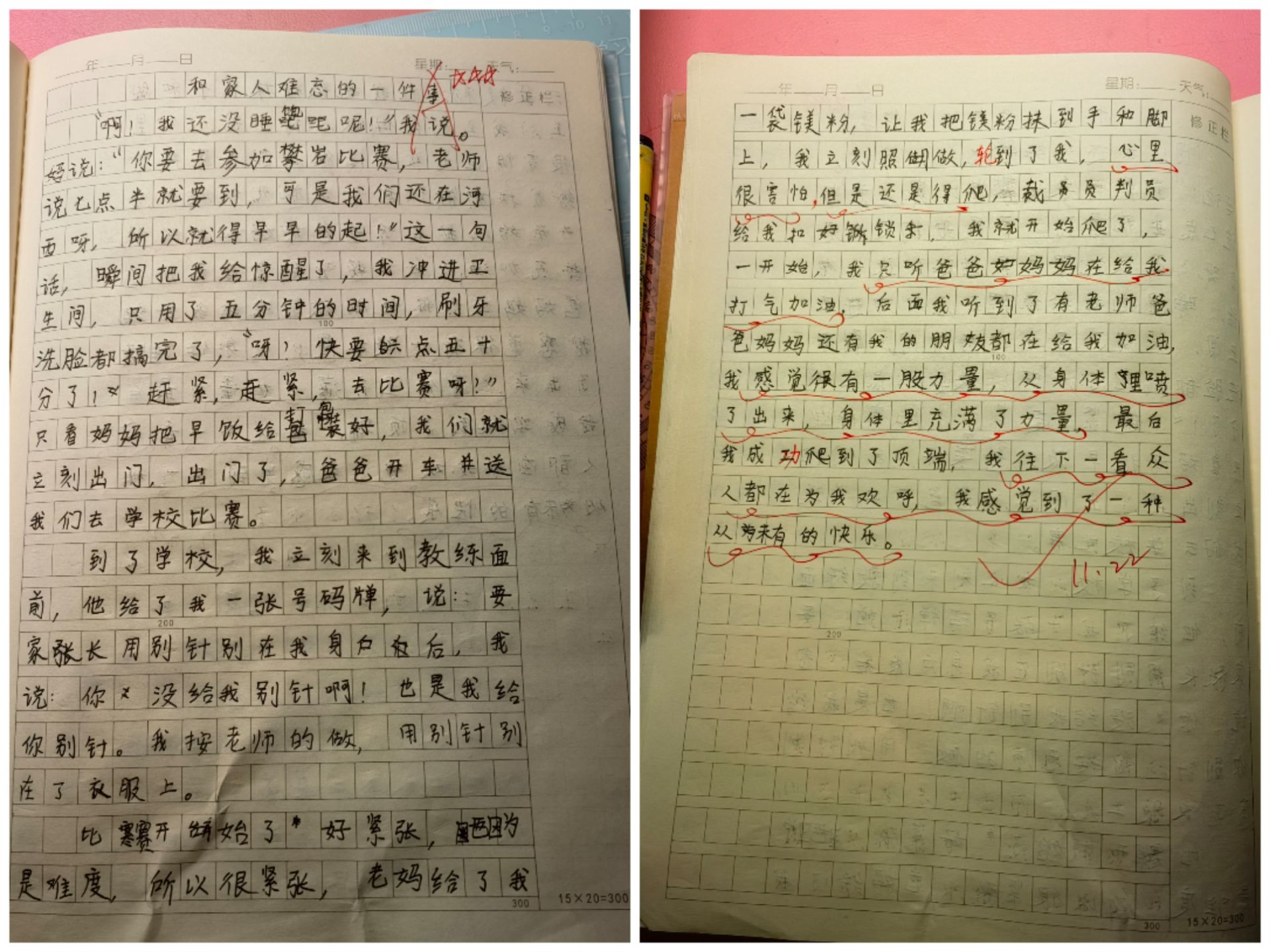 到了学校,我立刻来到教练面前,他给了我一张号牌号码牌,用别针别在衣服上。比赛开始了,好紧张,因为是难度,所以很紧张,妈给了我一袋镁粉,让我把镁粉抹到手和脚上,我立刻照做,轮到了,我心里很害怕,但是还是得爬。裁判员给我扣好锁,我就开始爬了。一开始我只听爸爸妈妈在给我加油打气,后面听到了有老师,爸爸妈妈,还有朋友都在给我加油。我感觉一股力量从身体里喷了出来,身体里充满了力量,最后我成功爬到了顶端,我往下一看,众人都在为我欢呼,我感觉到了一种从未有的快乐。