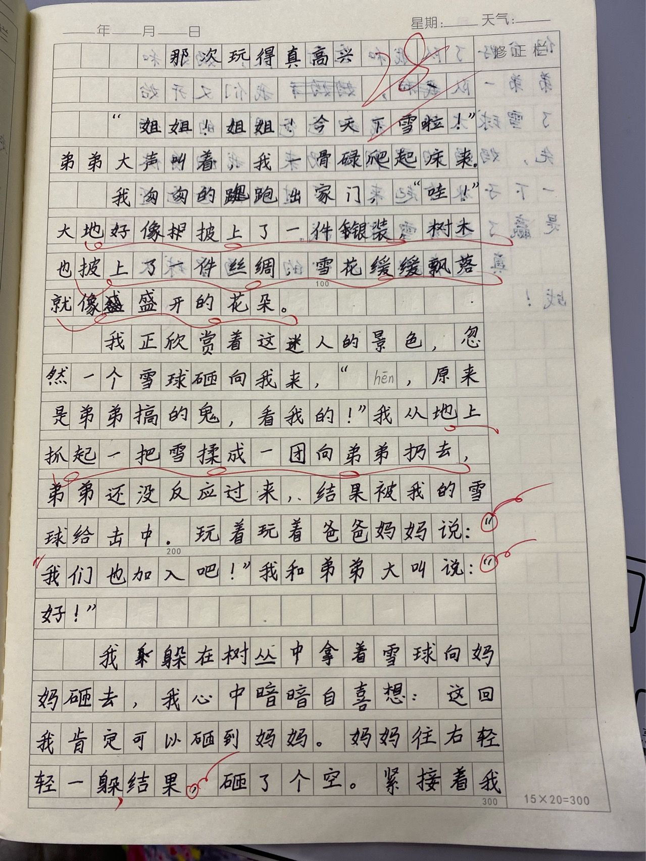 我匆匆的跑出家门,“哇!”大地好像披上了一件银装,树木也披上了一件丝绸,雪花缓缓飘落,就像盛开的花朵。 我正欣赏着这迷人的景色,忽然一个雪球砸向我来,“哼,原来是弟弟搞的鬼,看我的!”我从地上抓起一把雪揉成一团向弟弟扔去,弟弟还没反应过来,结果被我的雪球给击中。玩着玩着爸爸妈妈说:我们也加入吧!”我和弟弟大叫说:好!”