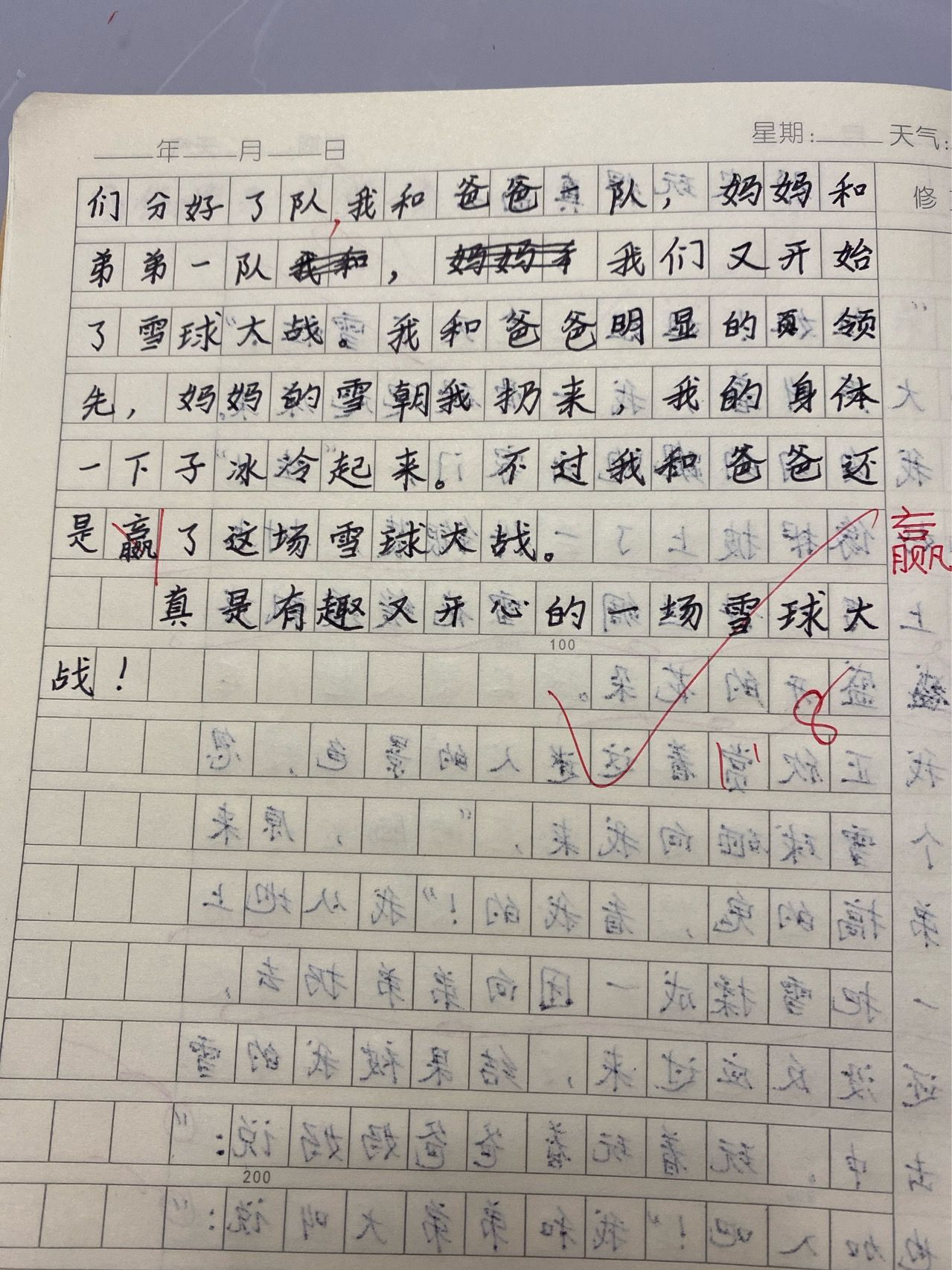 我躲在树丛中拿着雪球向妈妈砸去,我心中暗暗自喜想:这回我肯定可以砸到妈妈。妈妈往右轻轻一躲,结果砸了个空。紧接着我们分好了队,我和爸爸队,妈妈和弟弟一队,我们又开始了雪球太战。我和爸爸明显的领先,妈妈的雪朝我扔来,我的身体一下子冰冷起来。不过我和爸爸还是赢了这场雪球大战。