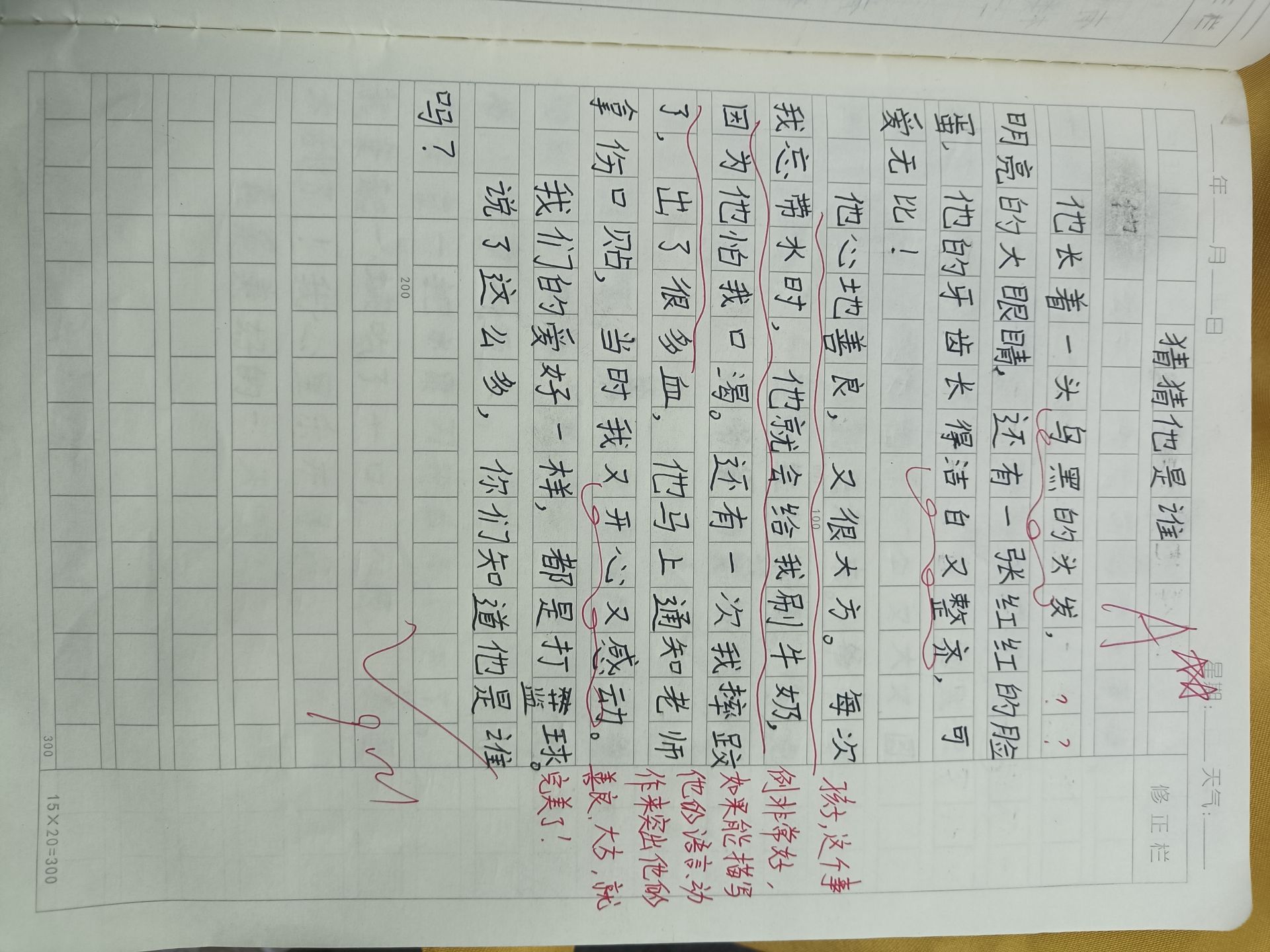 尖头发、瓜子脸,尤其是红蓝色的球衣,他个子特别高,和他玩时,嗖!下一秒就跑得无影无踪,好像跑到世界尽头!他还是一个体育健将,跑在最前面。